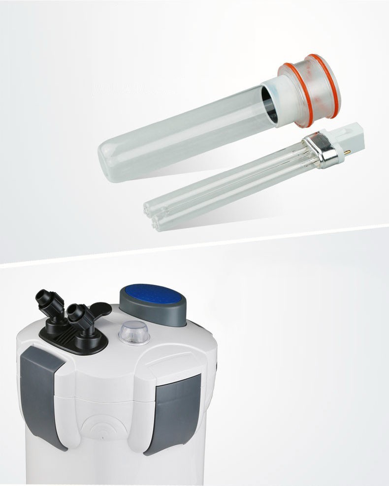 Za sterylizację wody odpowiada silna lampa UV-C. Posiada ona szerokie spektrum działania, które odpowiada za utrzymanie wody w doskonałej jakości. Niezwykle skutecznie zabija wszelkie zarodniki glonów i bakterii odpowiedzialnych za powstawanie sinic lub chorób. Lampa posiada przełącznik, dzięki któremu dostosować można stopień sterylizacji wody względem potrzeb zbiornika. Regularne używanie lampy skutecznie chroni zbiornik przed przykrymi niespodziankami. Obudowa lampy posiada mały wizjer, który informuje użytkownika o pracy lampy.