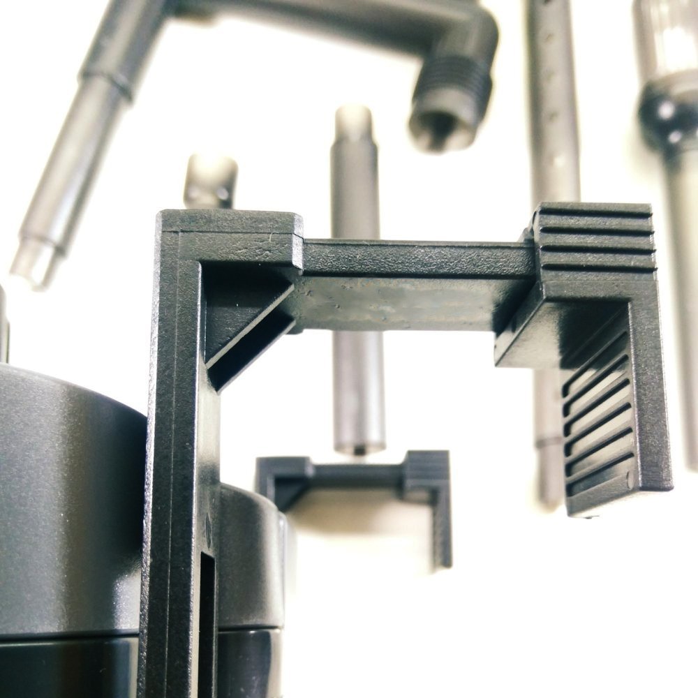 Filtr umieszczany jest na krawędzi zbiornika za pomocą specjalnych wieszaków. Uchwyty te posiadają regulację umożliwiającą dopasowanie ich do grubości szkła w zakresie od 4mm do 20mm. Specjalna stopka utrzymuje filtr w pionie. Wykonanie jej z elastycznej i miękkiej gumy doskonale tłumi drgania powstałe z pracy wirnika i przepływu wody czyniąc filtr niesłyszalnym.