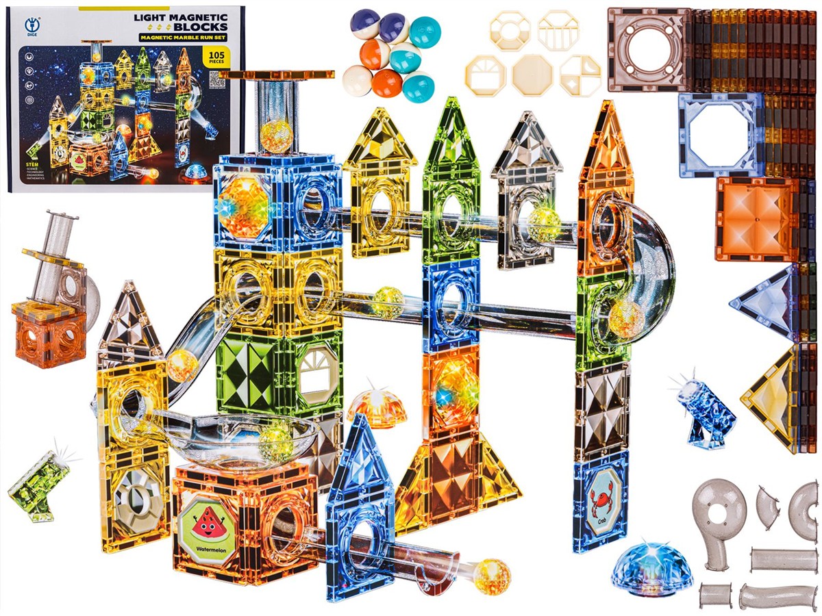 Klocki Magnetyczne Konstrukcyjne TOR KULKOWY Świecące Elementy 105 El. Kulodrom Przecena