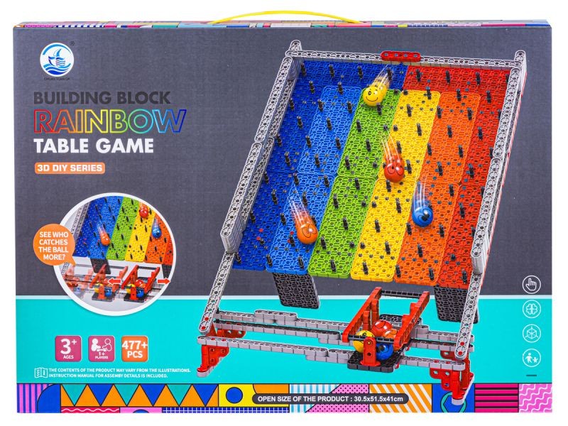Tęczowa plansza to zabawka do samodzielnego zbudowania. Zestaw składa się z wielu kolorowych elementów i pozwala na zbudowanie pochyłej płaszczyzny, po której toczyć się będą kulki.
