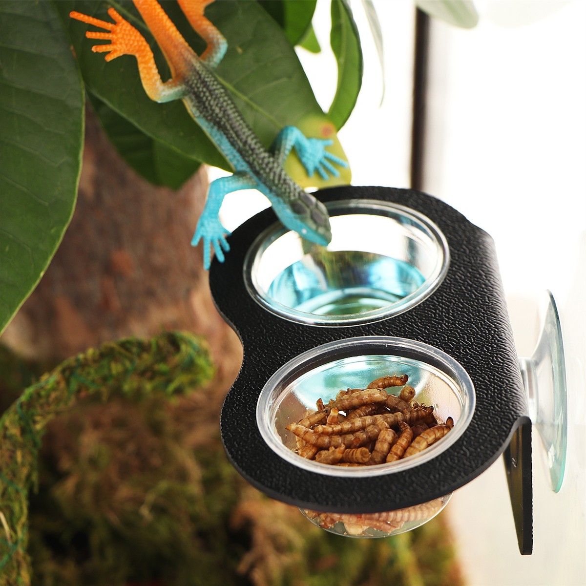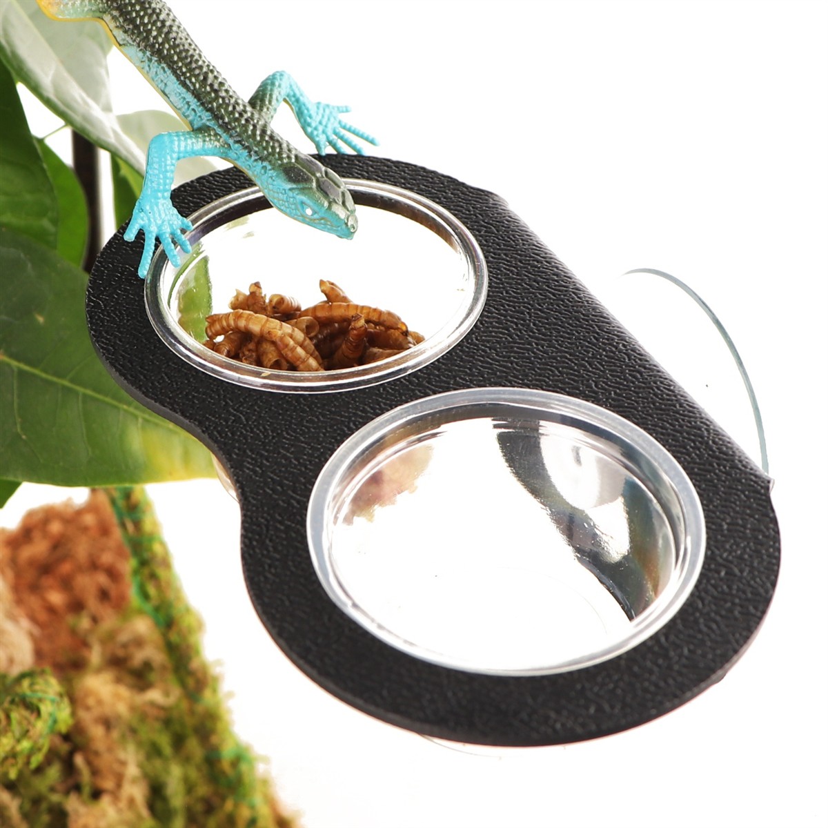 Miska wisząca sprawdzi się doskonale do podawania pokarmów i płynów wszystkim gadom i płazom nadrzewnym np: Gekon Orzęsiony. Stabilny i mocny chwyt zapewnia przykręcana przyssawka. Wyposażona jest w dwie łatwo wyjmowane miseczki o różnej pojemności.