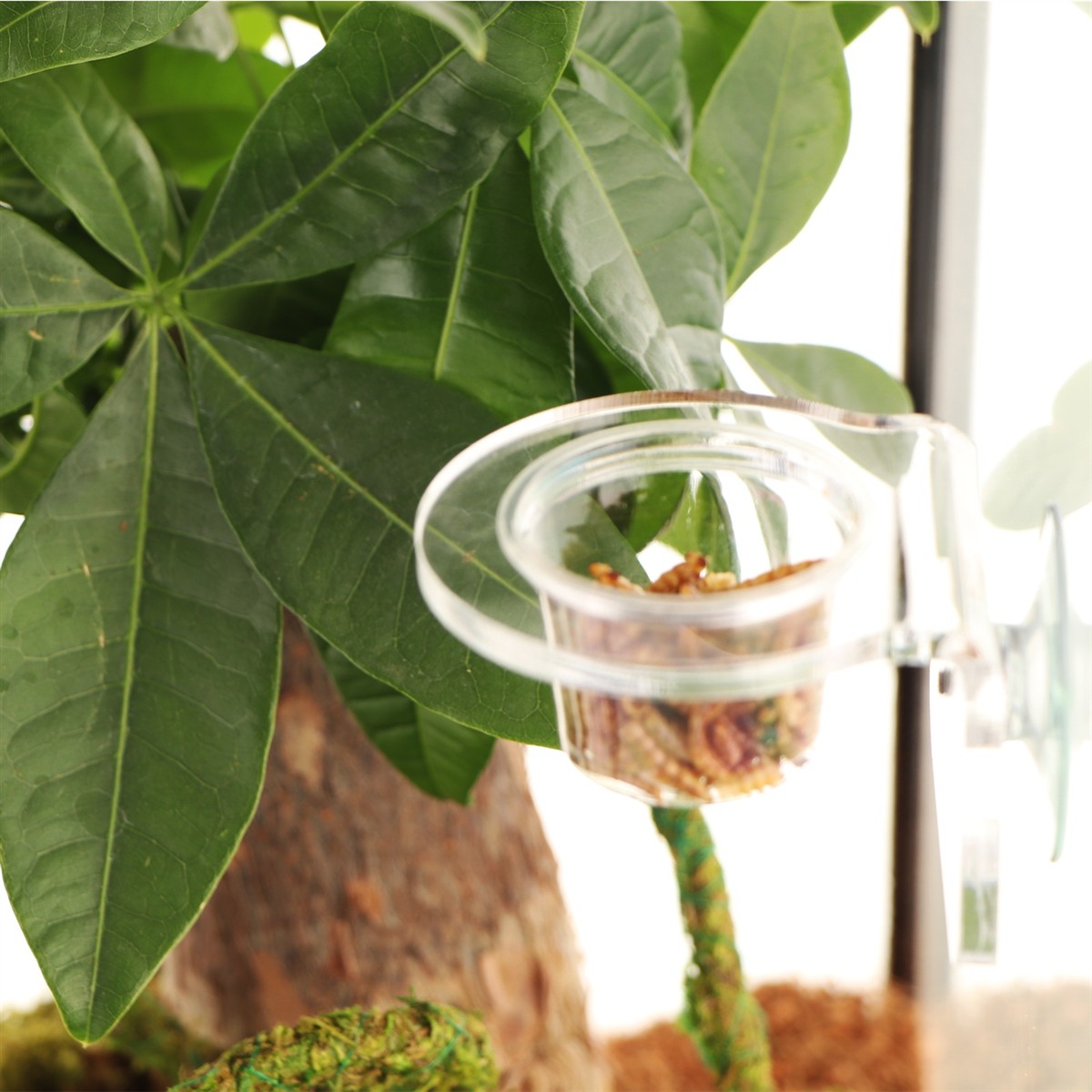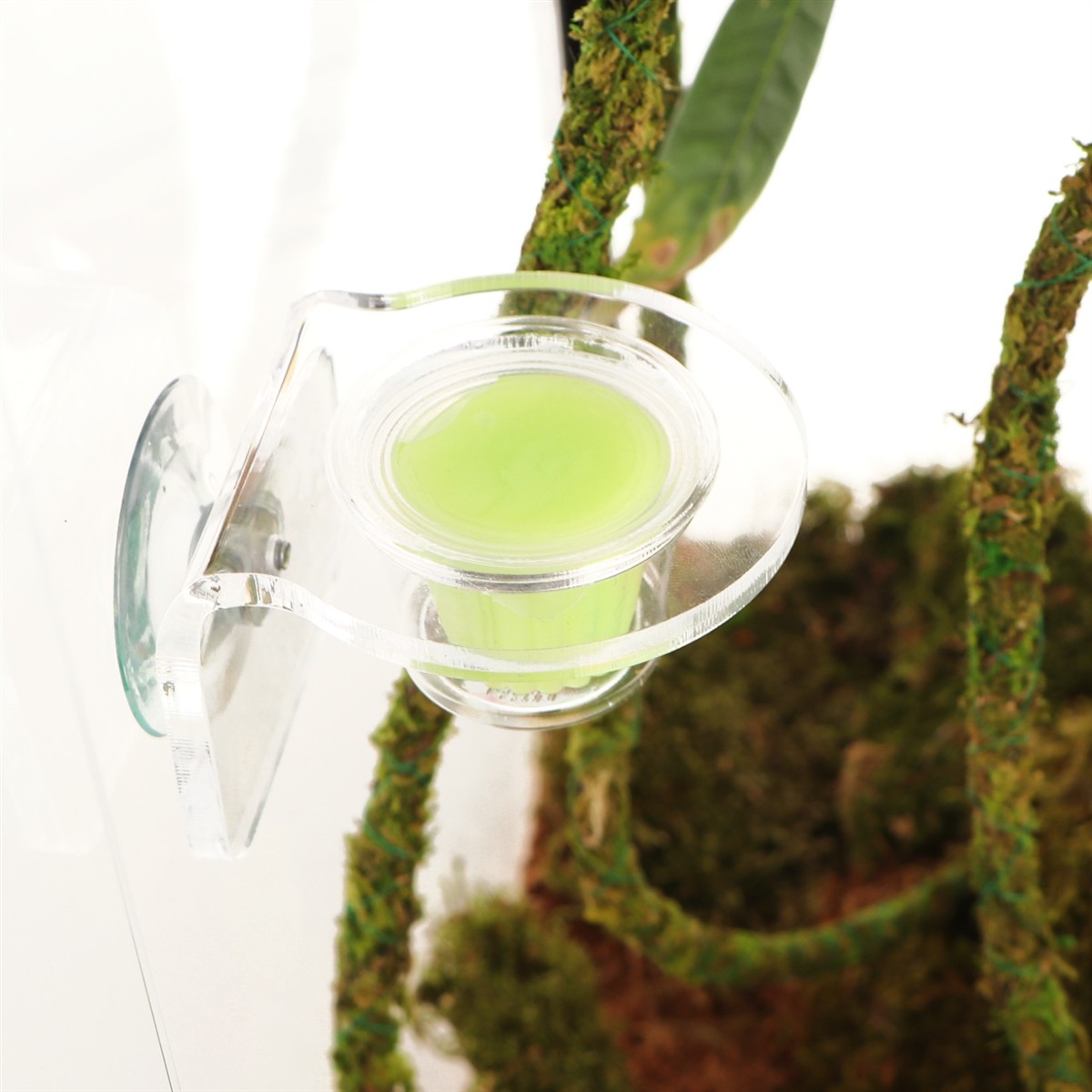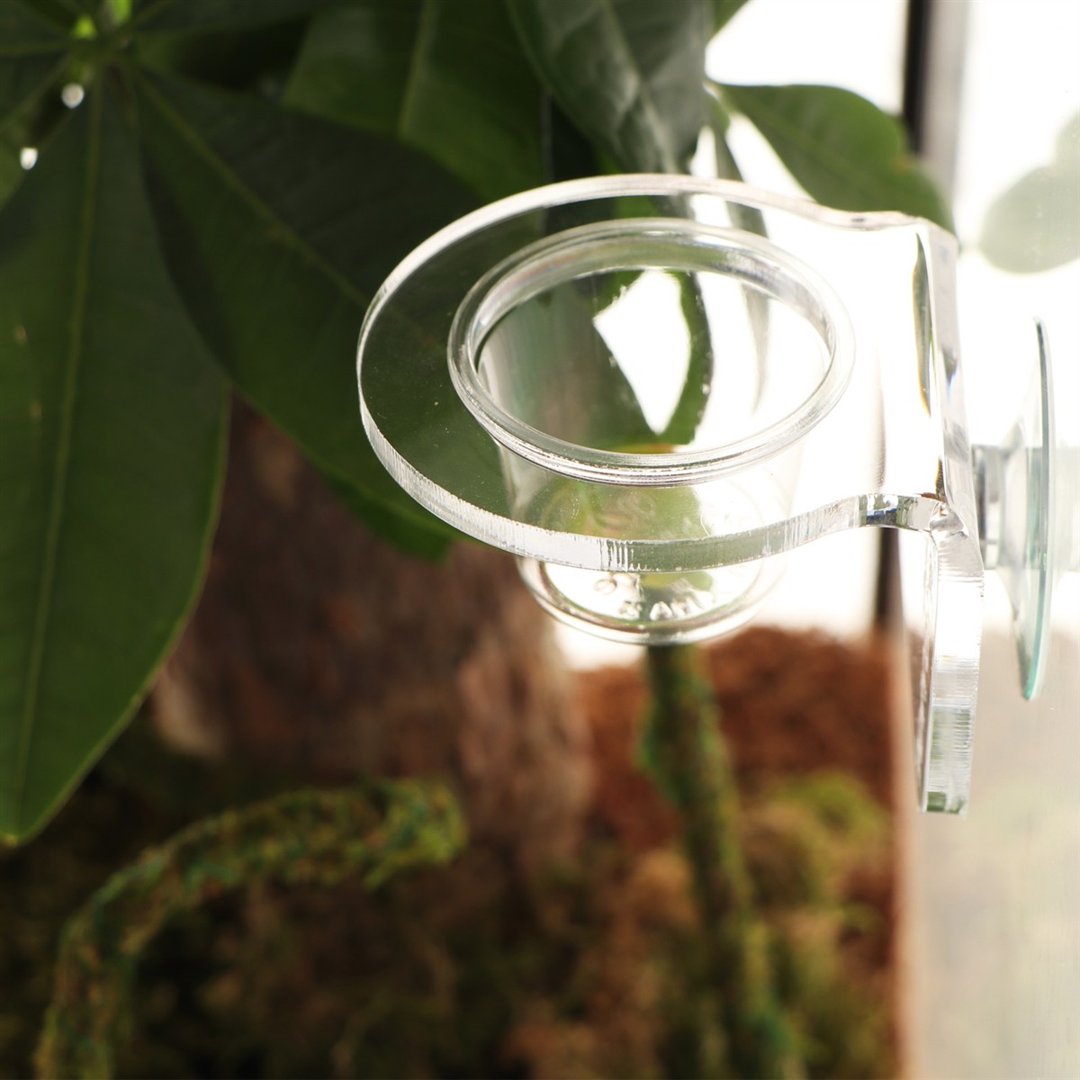 Przyssawki, akrylowy korpus i plastikowe miseczki. Wszystko jest przejrzyste bardziej niż szkło. Miska staje się niewidoczna w terrarium, aby nie zakłócać jego naturalnego wystroju.