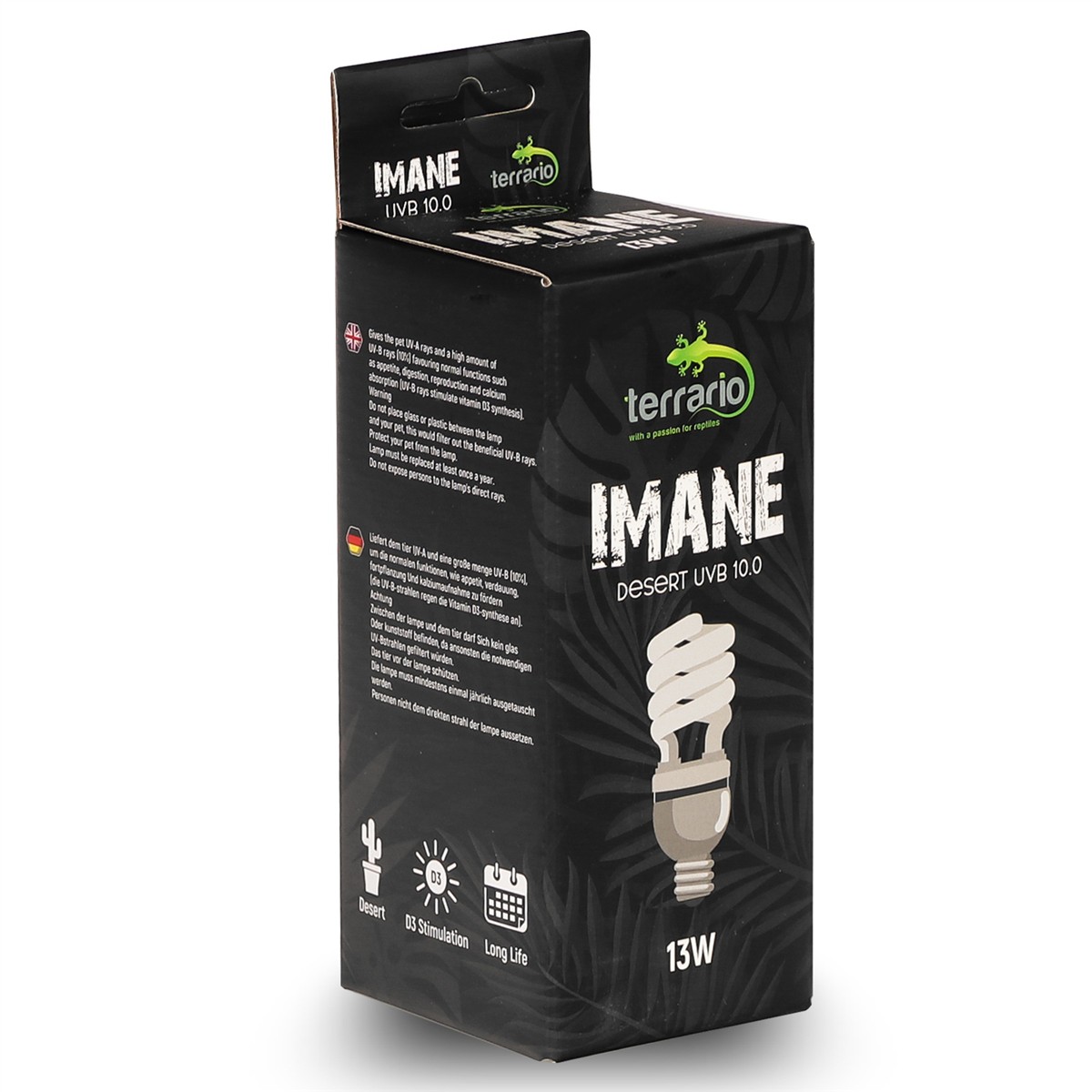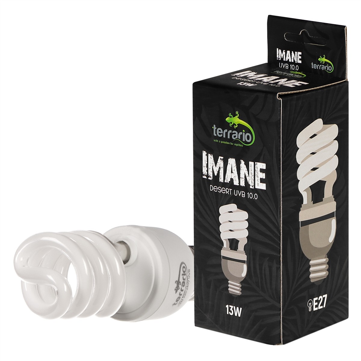 Terrario Imane Desert to żarówka spiralna stworzona dla gadów pochodzących z rejonów pustynnych i półpustynnych. Zapewnia zwierzęciu promienie UV-A i dużą ilość promieni UV-B (10%), przez co sprzyja funkcjom takim, jak apetyt, trawienie czy reprodukcja.