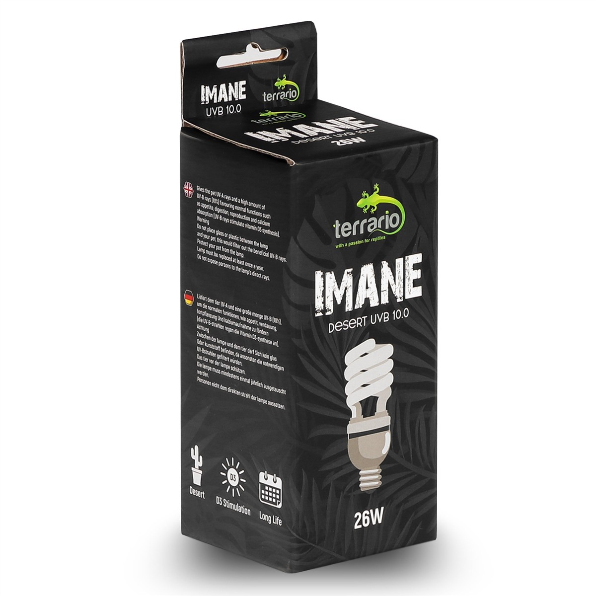 Terrario Imane Desert UVB 10.0 to kompaktowa terrarystyczna żarówka emitująca promienie UVA i dużą ilość promieni UVB (10%). Przeznaczona do terrarium pustynnego dla wszystkich gatunków gadów z terenów pustynnych. Sprzyja najważniejszym funkcjom, takim jak apetyt, trawienie, reprodukcja i wchłanianie wapnia (promienie UV-B stymulują syntezę witaminy D3).