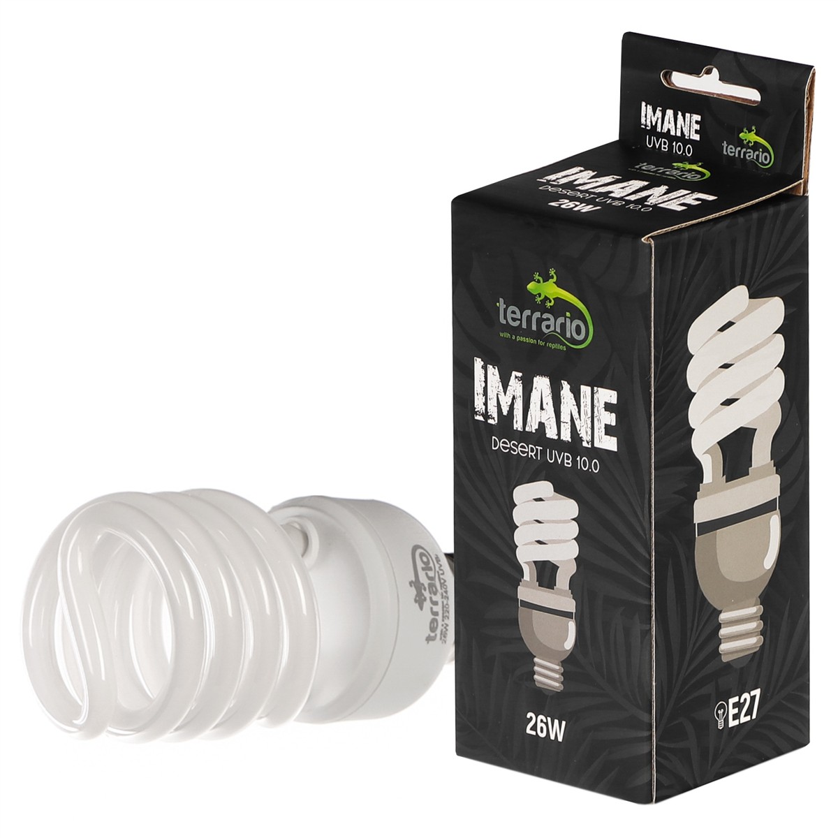 Terrario Imane Desert to żarówka spiralna stworzona dla gadów pochodzących z rejonów pustynnych i półpustynnych. Zapewnia zwierzęciu promienie UV-A i dużą ilość promieni UV-B (10%), przez co sprzyja funkcjom takim, jak apetyt, trawienie czy reprodukcja.