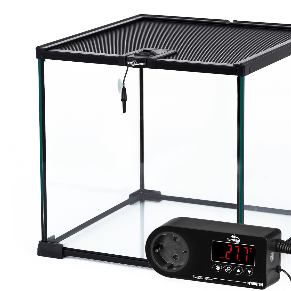 Termostat terrarystyczny bazujący na pracy mikroprocesorów. Gwarantuje automatyczne utrzymywanie się odpowiedniej temperatury w terrarium. Duży wyświetlacz LCD umożliwia precyzyjne programowanie, a ponadto stale wyświetla obecną temperaturę w terrarium. Wyposażony w wodoodporną sondę z przyssawką.