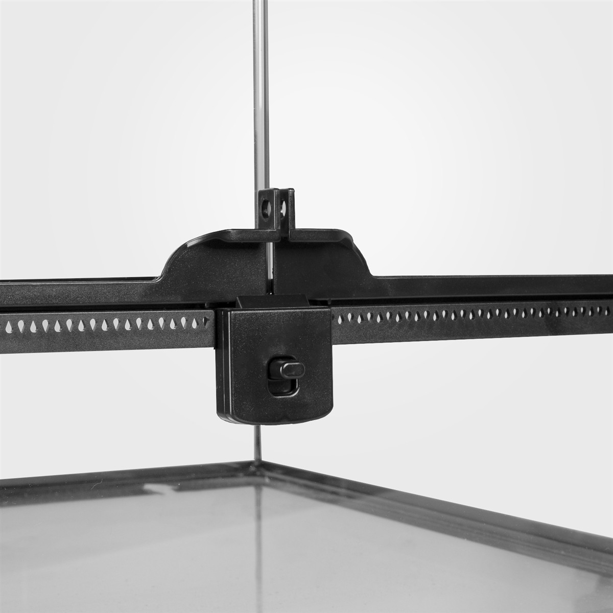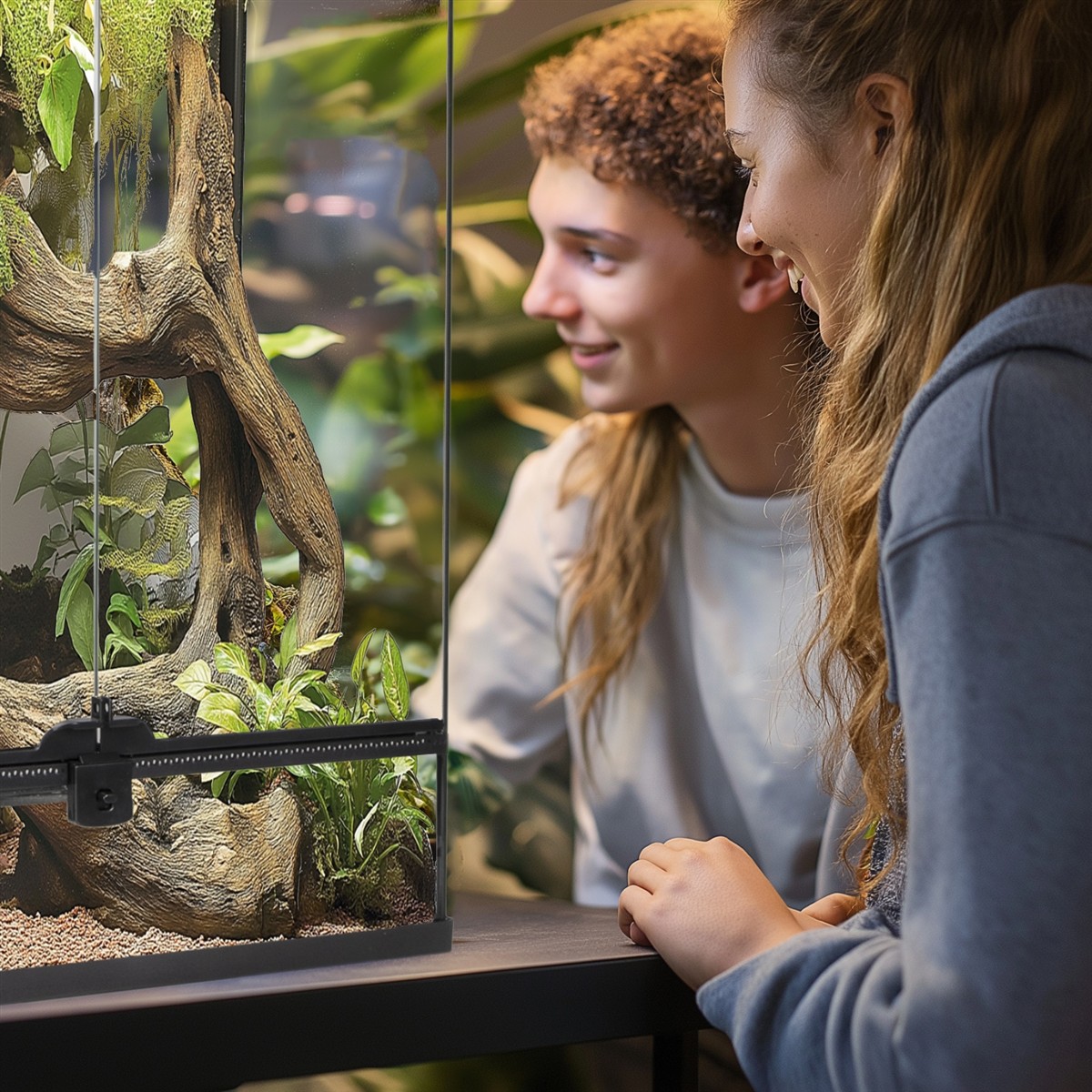 - Wodoodporne dno z maksymalnym poziomem zalania do 9 cm: idealne dla gadów i płazów, które potrzebują odrobiny wilgoci lub basenu w dolnej części terrarium.