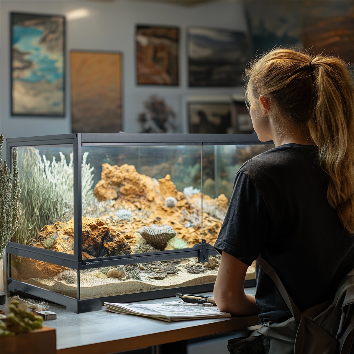 Terrarium szklane Terrario Santuario Natural 40 to elegancki i funkcjonalny wybór dla miłośników pustynnych gadów. Zapewnia doskonałą wentylację, solidną konstrukcję i praktyczne rozwiązania, takie jak wodoodporne dno oraz możliwość zabezpieczenia drzwiczek kłódką. Idealne do stworzenia bezpiecznego, komfortowego środowiska dla Twoich zwierząt.