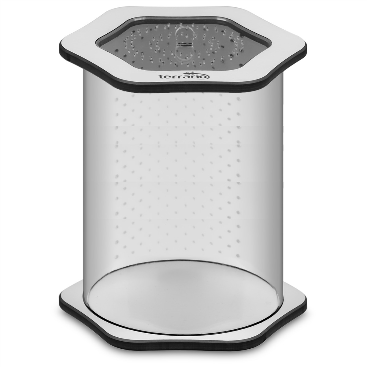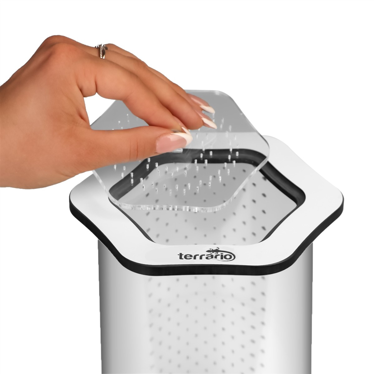 Wysokiej klasy i elegancji terrarium dla pająków, modliszek i owadów. Wykonane z płyty tworzywa sztucznego oraz akrylu nadaje nowoczesny wygląd terrarium, co sprawia, że jest odpowiednie nie tylko do wnętrza Twojego mieszkania, ale również biura czy poczekalni. Posiada mikrowentylację oraz otwierane wieczko.