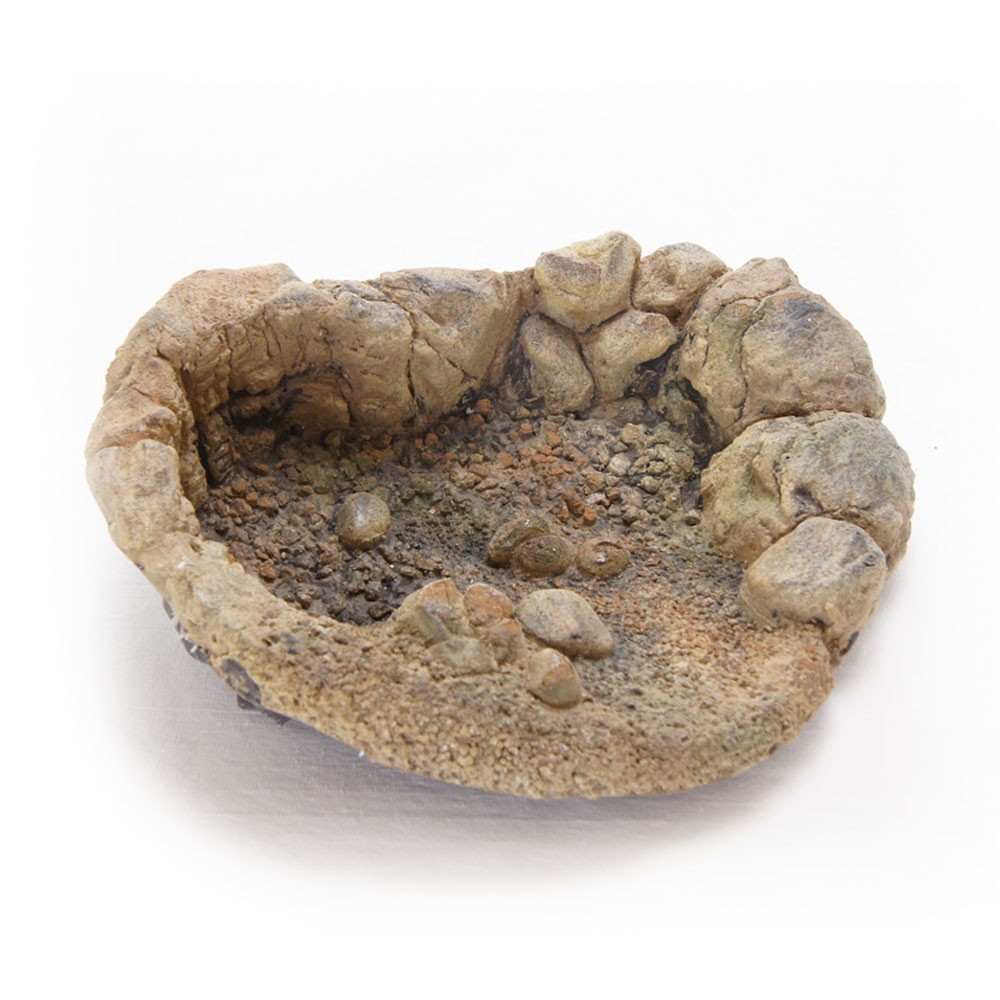 Miska o unikalnym kształcie zagłębienia oczka wodnego. Wyróżnia się nie tylko kształtem ale przede wszystkim naturalnym wyglądem, dzięki fakturze skał, piasku i żwiru. Proces malowania ręcznego dopełnia realistyczny wygląd, a akcesorium staje się ozdobą terrarium a nie tylko niezbędnym elementem wyposażenia.