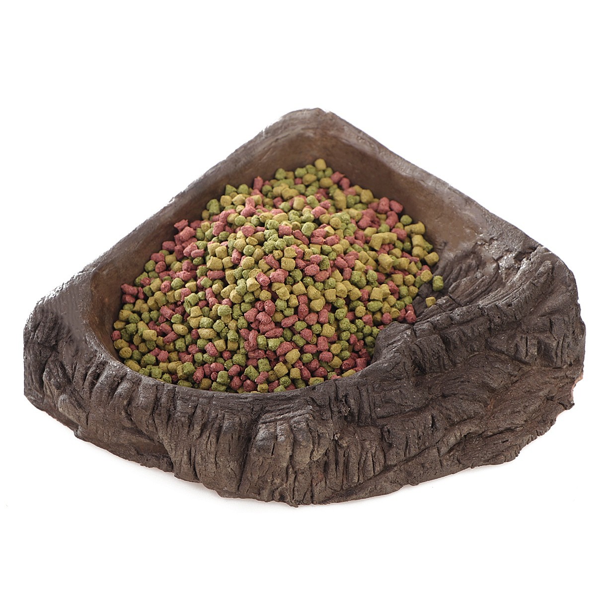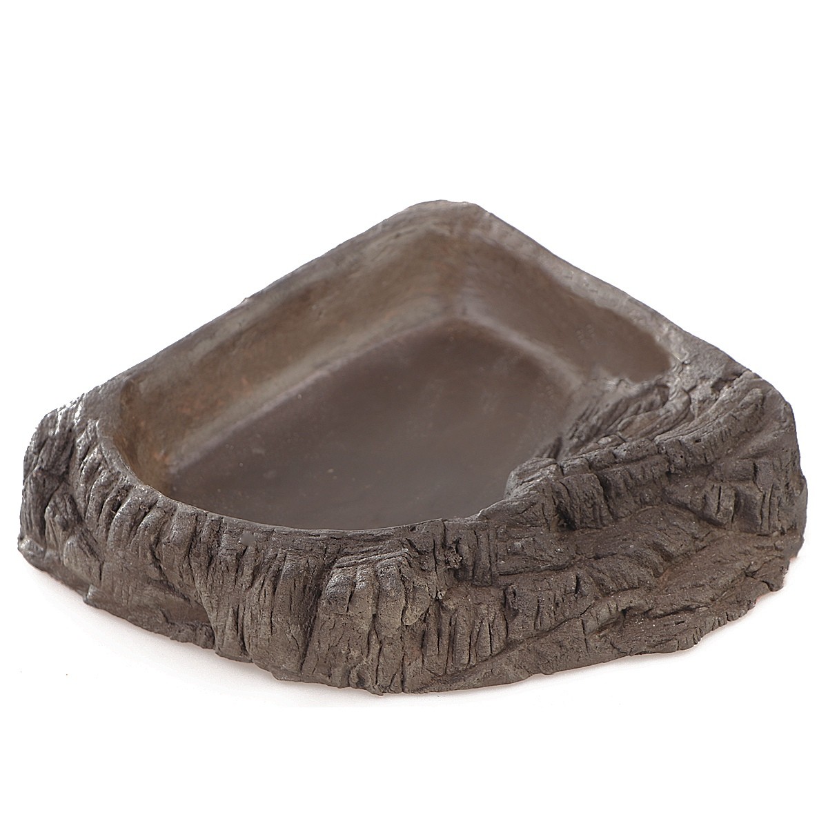 Rogowa miska na wodę i pokarm. Wygląda jak kawałek starego pnia drzewa. To świetna dekoracja terrarium, pełniąca jednocześnie ważną rolę. Rogowy kształt pomoże Ci umieścić miskę w rogu terrarium zaoszczędzając miejsce wewnątrz.