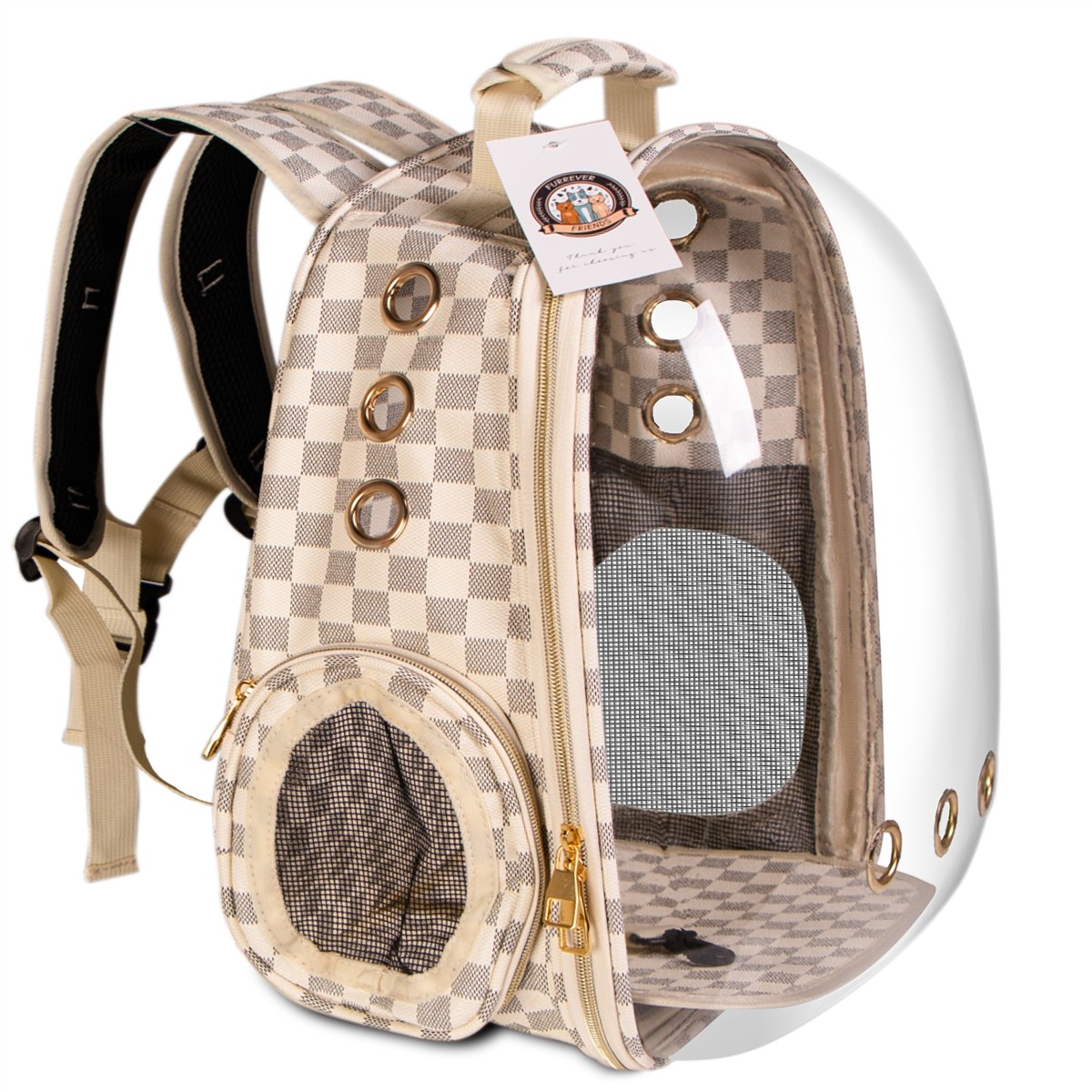 Transporter - plecak dla kota lub psa. Idealny do podróży małych i dużych oraz do wizyty u weterynarza. Duża sztywność w połączeniu z bardzo odpornym materiałem i pancernymi zamkami sprawią, że Twój kot czy pies nie będzie w stanie zniszczyć tego transportera i będzie mógł się cieszyć podróżami bez końca. Otwierana w całości przednia przeźroczysta klapa, wentylacje czy mała smycz wewnątrz to tylko niektóre udogodnienia.