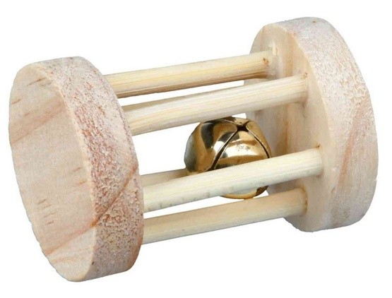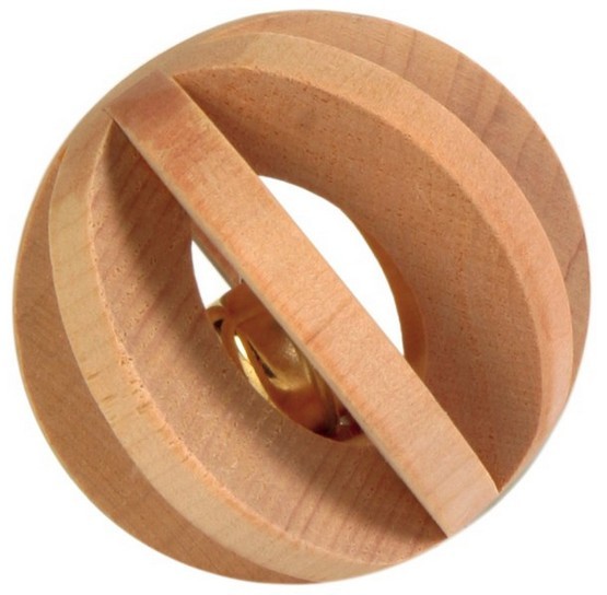 Drewniana piłka z dzwonkiem dla gryzoniPiłka służy do zabawy, przeznaczona jest dla gryzoni lub królika.Dzwoneczek ukryty we wnętrzu zabawki stanowi dodatkową atrakcję.  Materiał: drewno Średnica: 6 cm