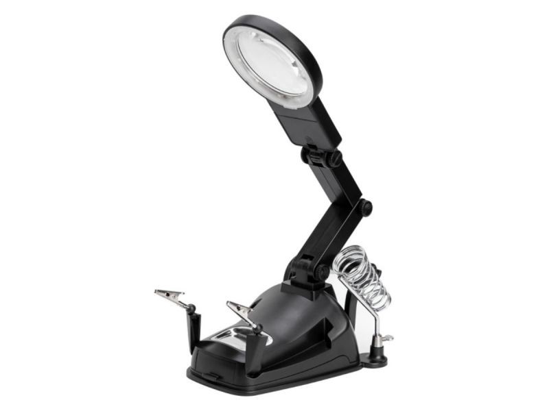 Uchwyt posiada regulowane szczypce, lupę można przesuwać góra/dół, przód/tył aby uzyskać idealne ułożenie. Dodatkowo produkt posiada spiralny uchwyt na lutownicę oraz szpulę na cynę.
