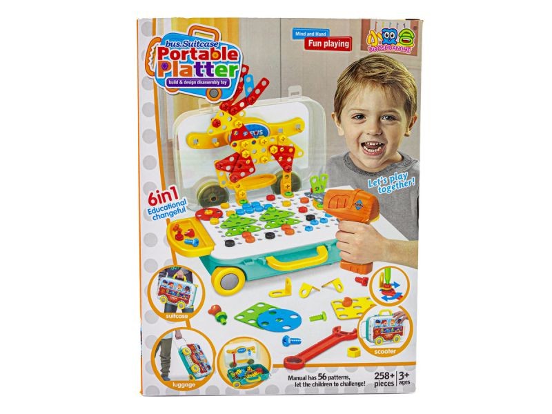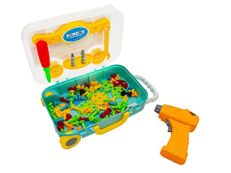 Kreatywna mozaika w walizce z śrubami i wkrętarką. Zestaw elementów konstrukcyjnych w zestawie z śrubokrętem i wkrętarką przypadnie do gustu każdemu małemu majsterkowiczowi.