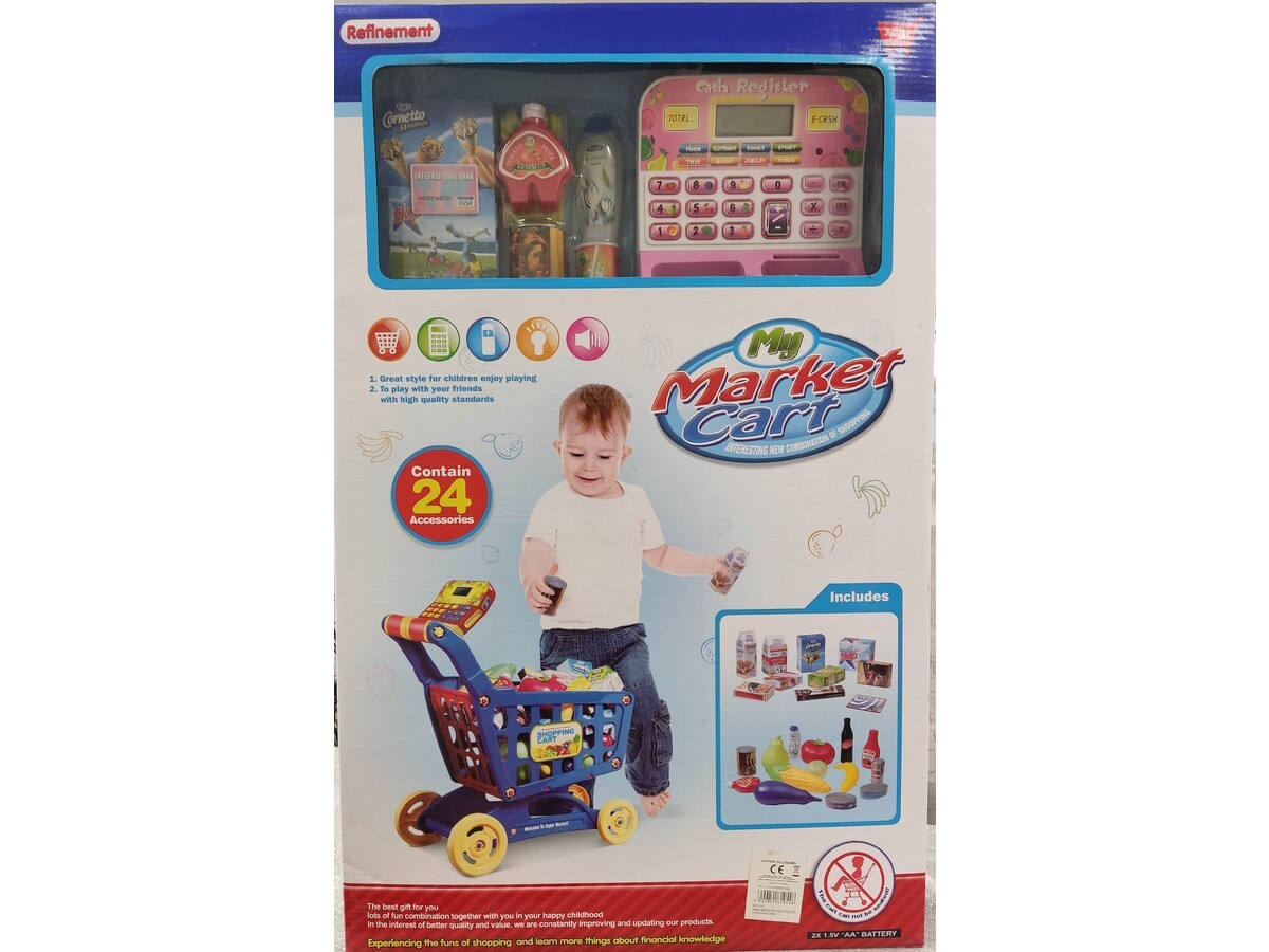 Zestaw zawiera wózek, kasę-kalkulator oraz mnóstwo artykułów.