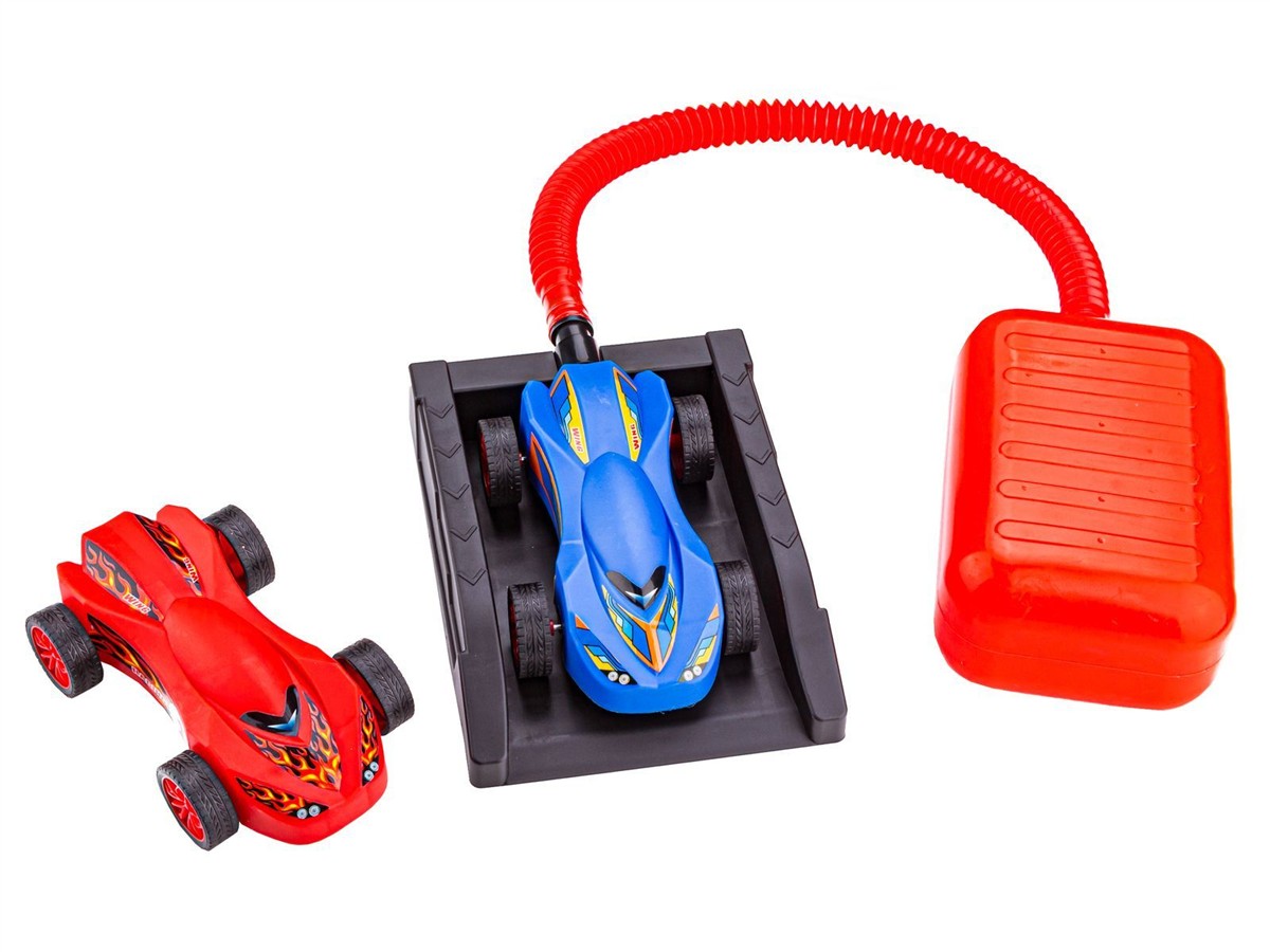 Składamy wyrzutnię łącząc podstawę oraz pompkę. W zależności od tego czy chcemy bawić się wyścigówkami czy rakietami nakładamy na koniec wyrzutni odpowiednią końcówkę. Następnie na zakończeniu umieszczamy zabawkę. Energicznie naduszamy nogą na pompkę. Naduszenie powoduje wzrost ciśnienia wewnątrz rurki. Powietrze znajduje ujście na końcu rurki - wyrzucając naszą rakietę wysoko w powietrze lub auto daleko przed siebie. Im mocniej naciśniemy pompkę - tym dalej mknie nasz pojazd lub leci rakieta. To super zabawa.