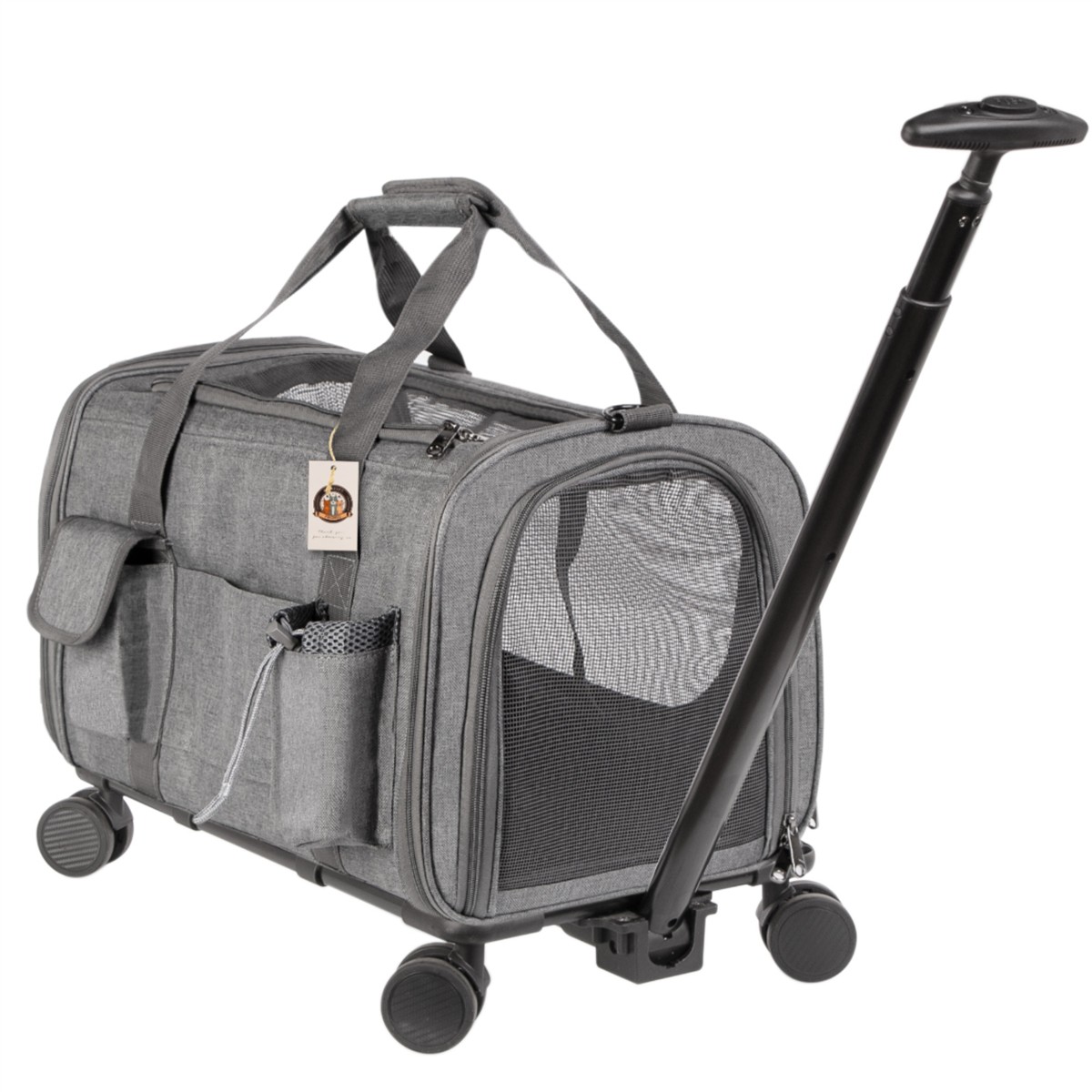Transporter na kółkach dla kota lub psa. Idealny do podróży małych i dużych oraz do wizyty u weterynarza. Duża sztywność w połączeniu z bardzo odpornym materiałem i pancernymi zamkami sprawią, że Twój kot czy pies nie będzie w stanie zniszczyć tego transportera i będzie mógł się cieszyć podróżami bez końca. Otwierana w całości przednia i tylna klapa, otwierana dodatkowa klapa na górze i z przodu, smycz wewnątrz torby to tylko niektóre udogodnienia.