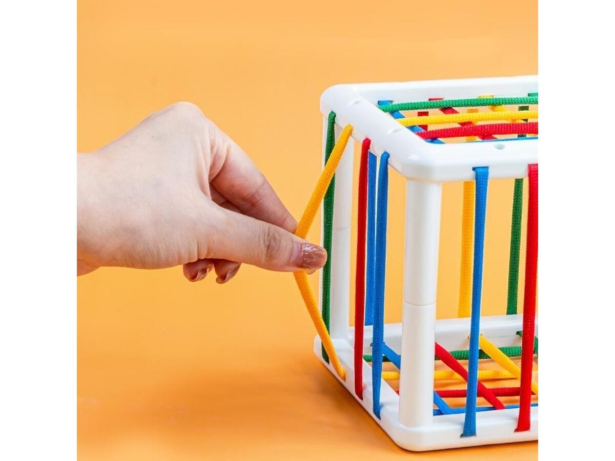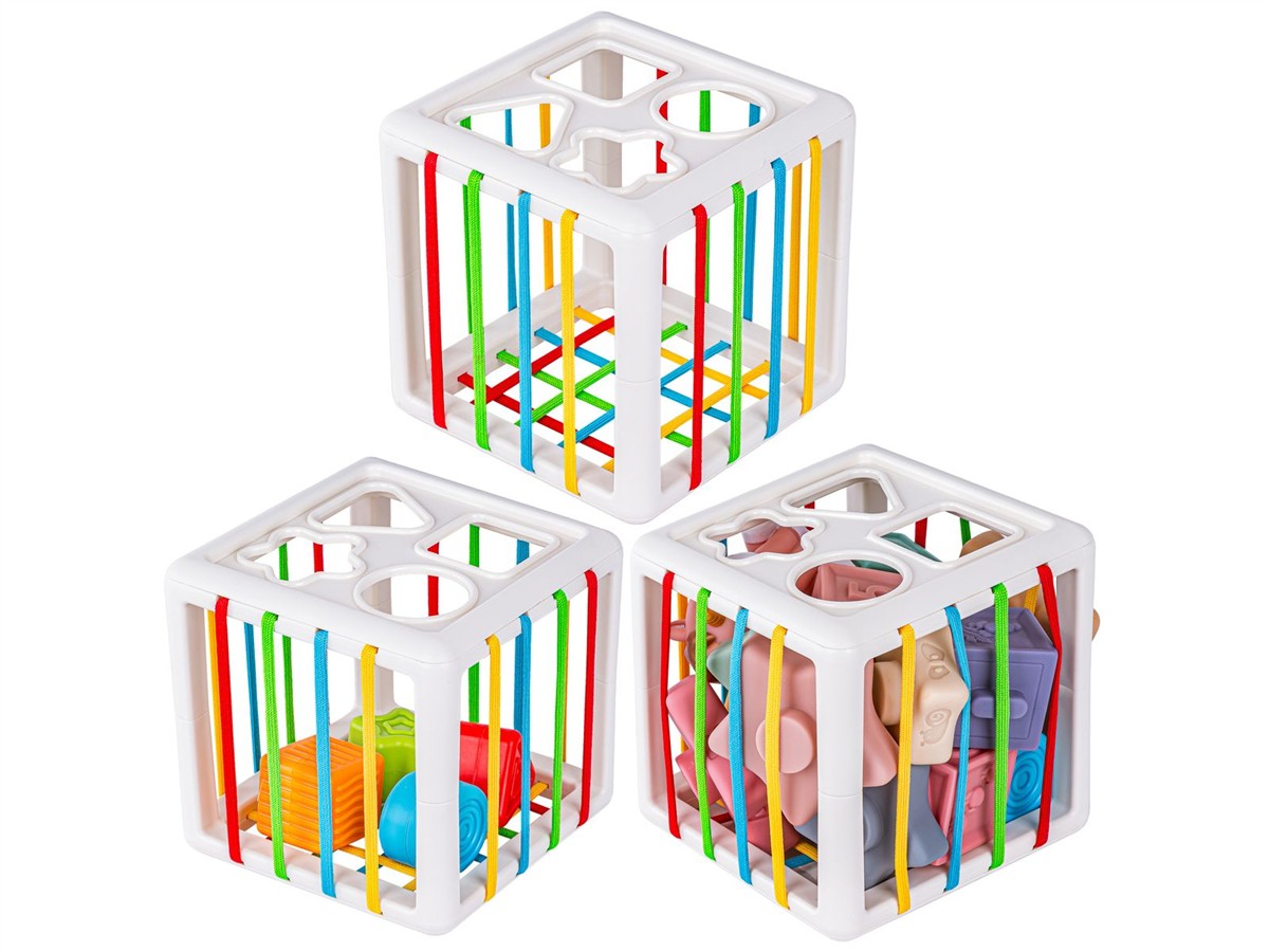 SorterKostka na górnej ściance posiada otwory do zabawy w dopasowywanie kształtów. Klocki dodatkowo mogą służyć do nauki kolorów. Znajdziemy tutaj elementy w kształcie: gwiazdki, kwadratu, trójkąta oraz koła. W celu wyjęcia klocków wystarczy przeciągnąć je przez elastyczne sznurki umieszczone na pozostałych ściankach. | ![]() |