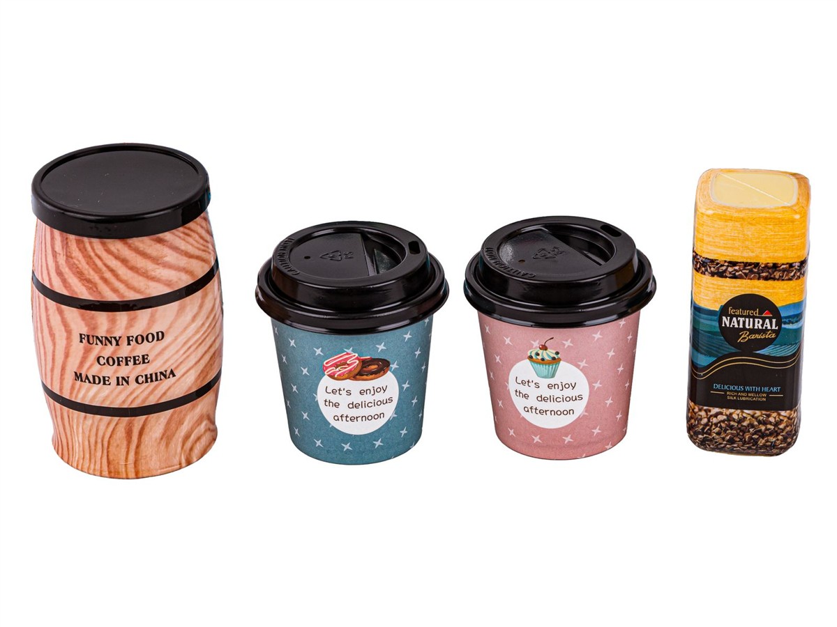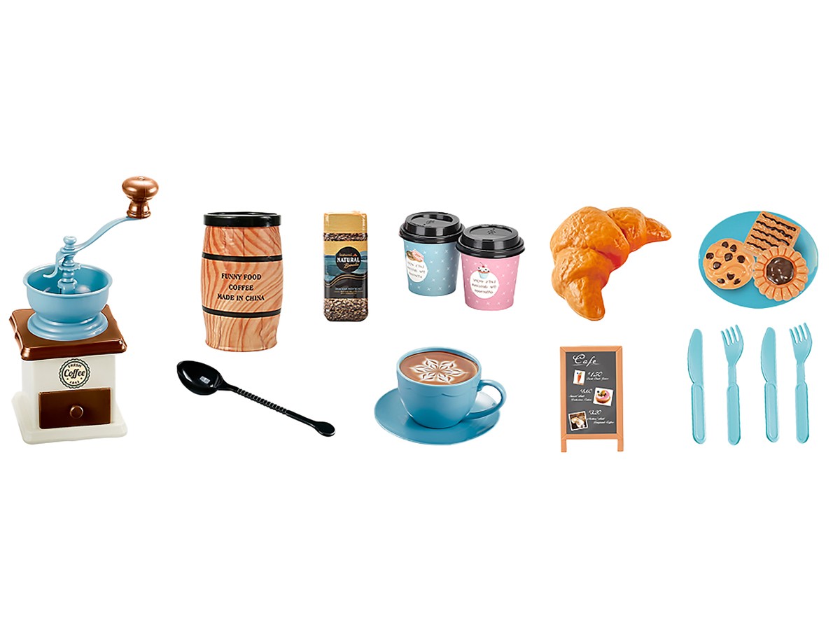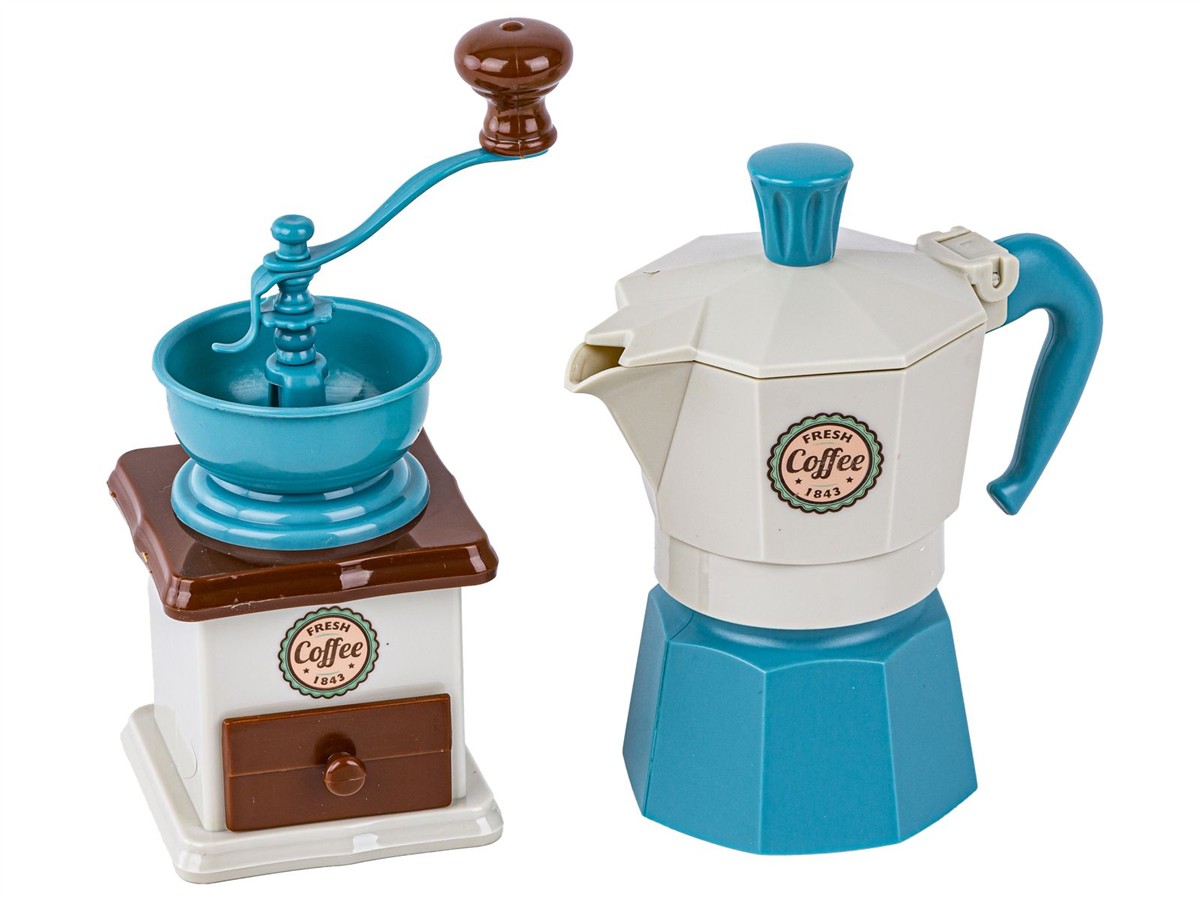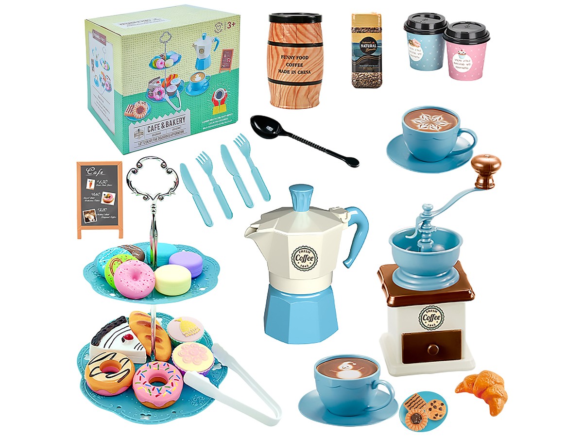 Do dyspozycji małego baristy jest cała gama produktów: młynek do mielenia kawy, kawiarka, filiżanki, słodycze na paterze oraz sporo dodatkowych akcesoriów.