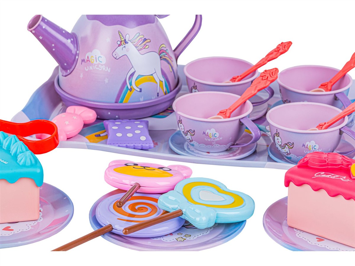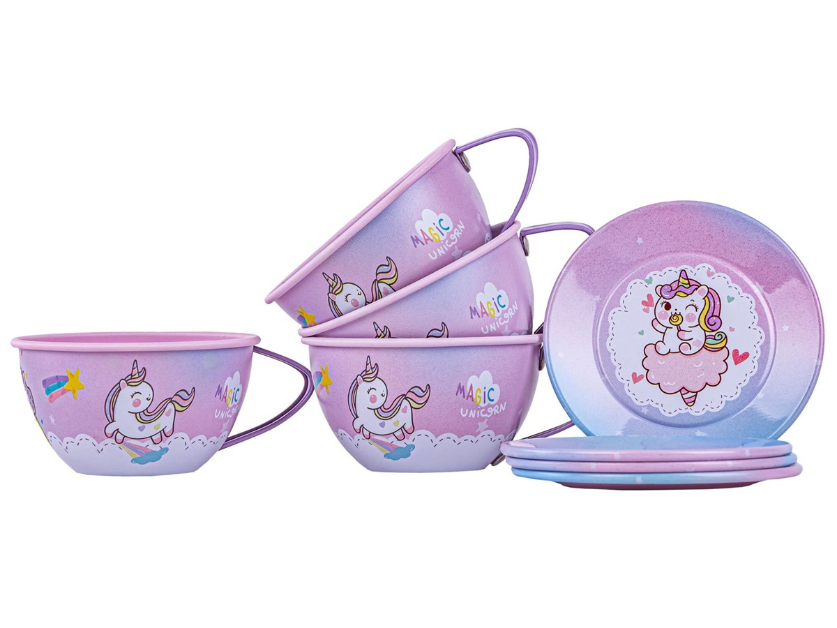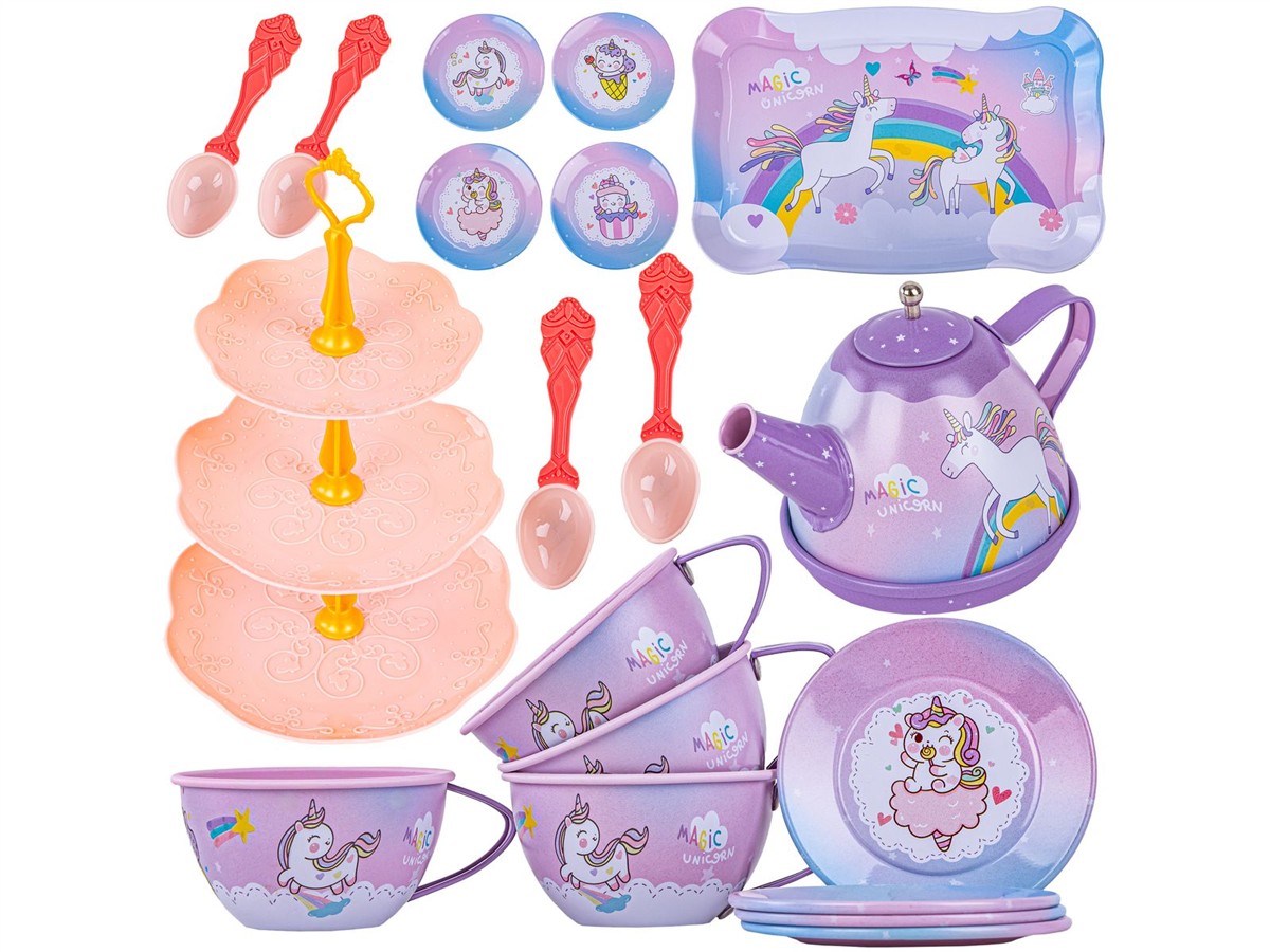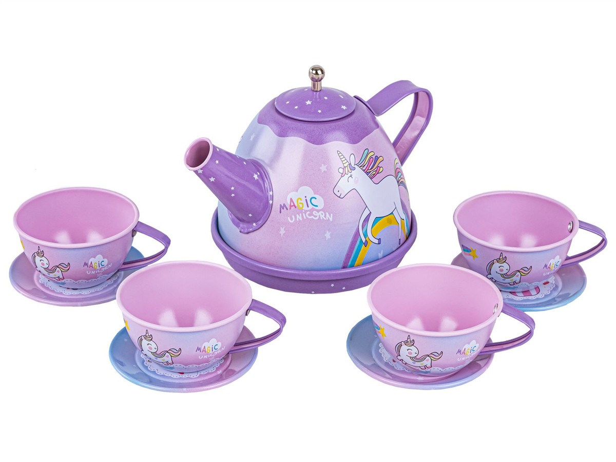 Tacka, filiżanki, talerzyki oraz czajniczek są metalowe, dzięki czemu są o wiele trwalsze od plastiku i na pewno długo posłużą.