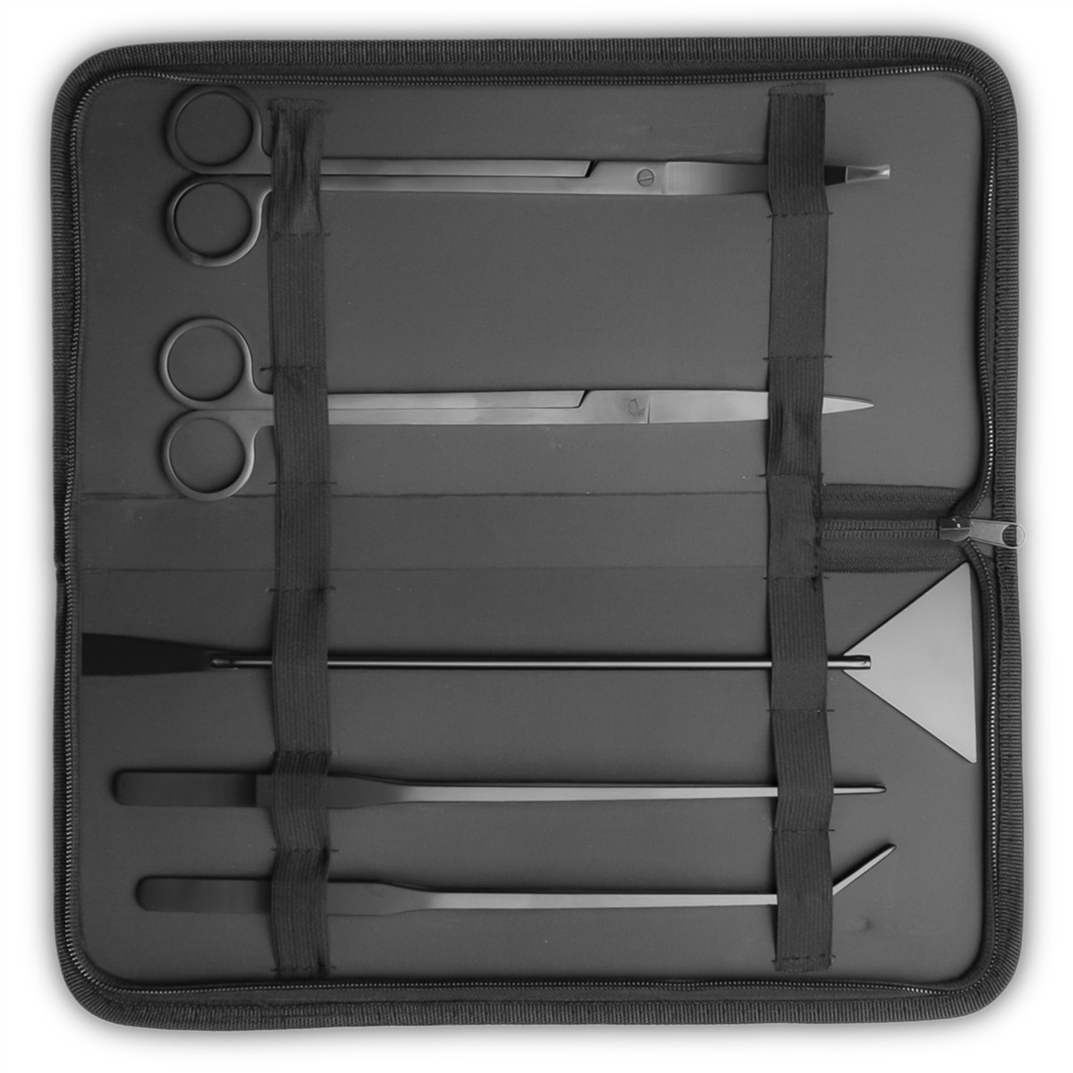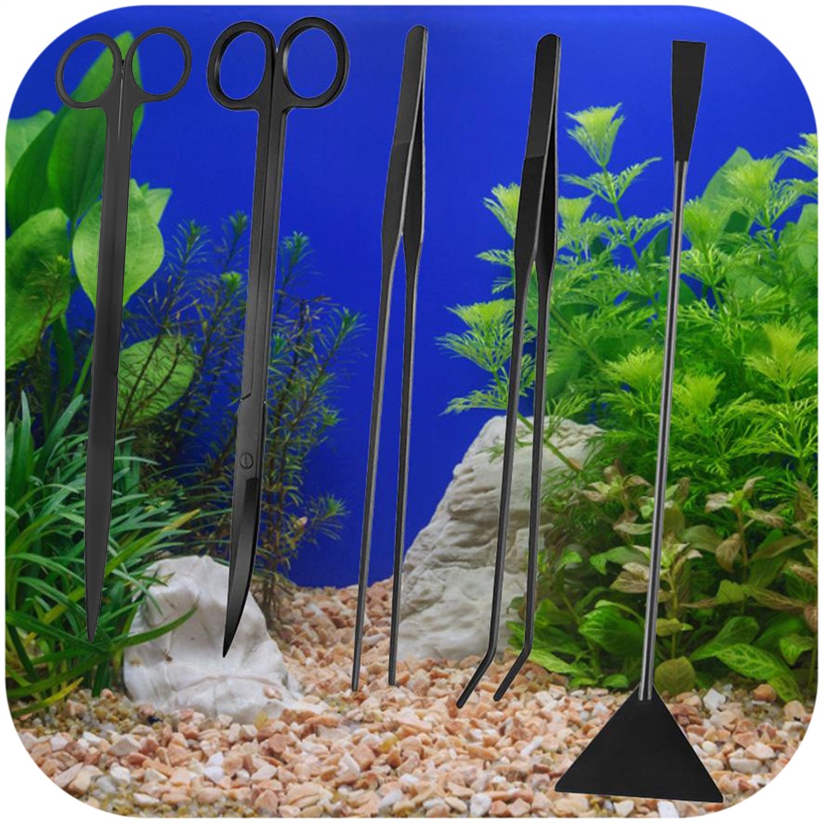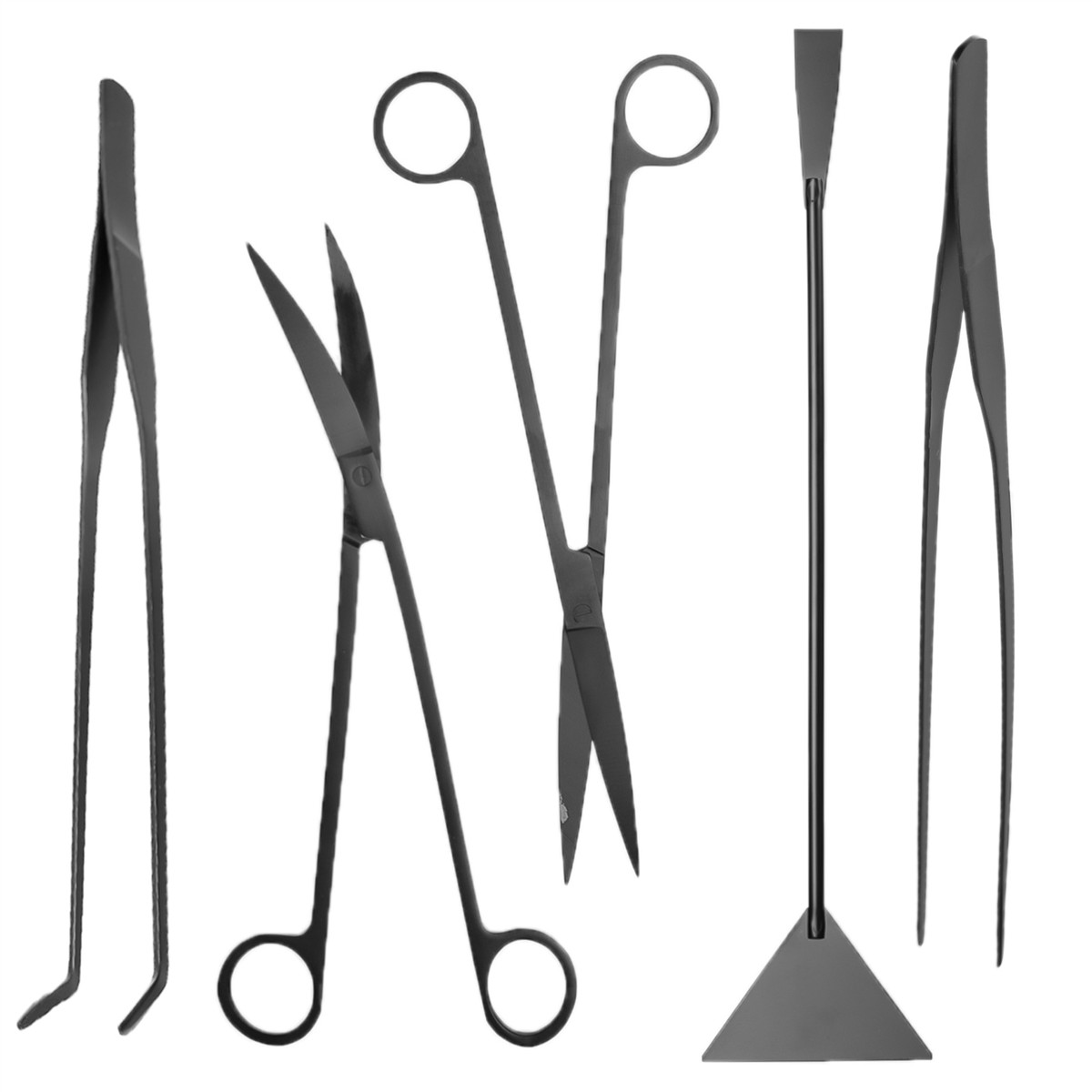 Zestaw przyborów do pielęgnacji akwarium, terrarium wyposażony w 5 elementów, czyli pęseta prosta i zakrzywiona, nożyczki proste i zakrzywione, sand flatter (szpatułka do podłoża). Zestaw jest doskonały do przesadzania, strzyżenia i podtrzymywania roślin podczas prac porządkowych oraz karmienia gadów i płazów.