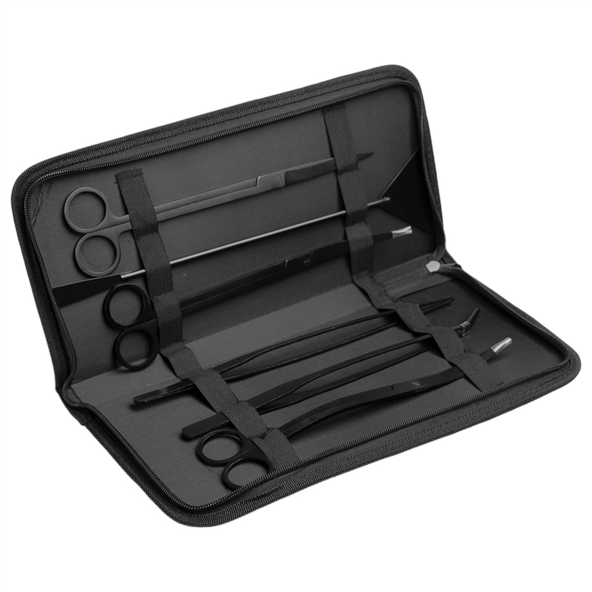 Zestaw przyborów do pielęgnacji akwarium, terrarium wyposażony w 6 elementów, czyli pęseta prosta i zakrzywiona, nożyczki proste, zakrzywione i wygięte w kształt litery „S” oraz sand flatter (szpatułka do podłoża). Zestaw jest doskonały do przesadzania, strzyżenia i podtrzymywania roślin podczas prac porządkowych oraz karmienia gadów i płazów.