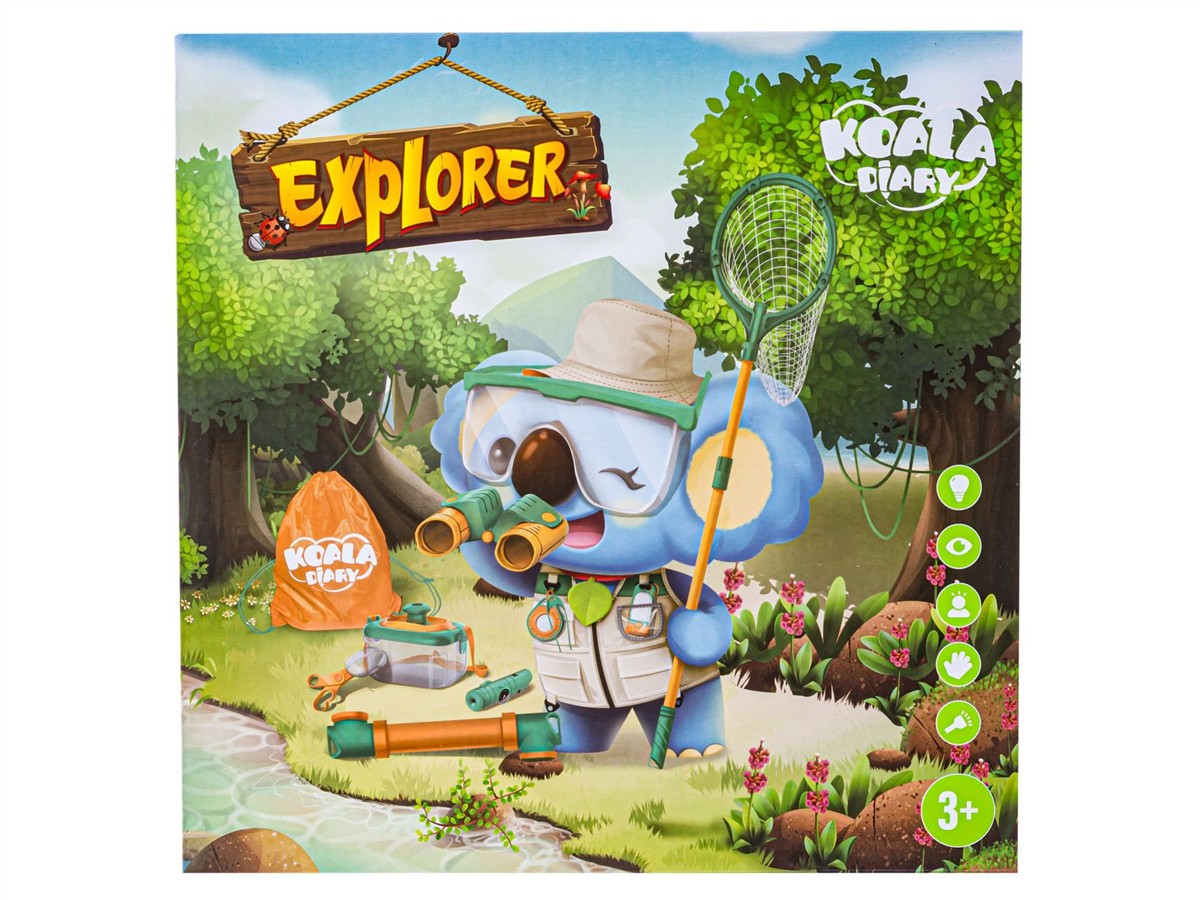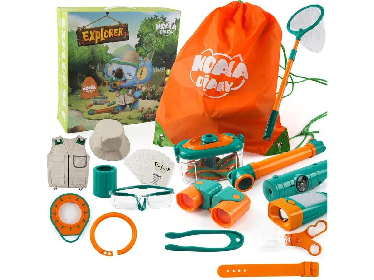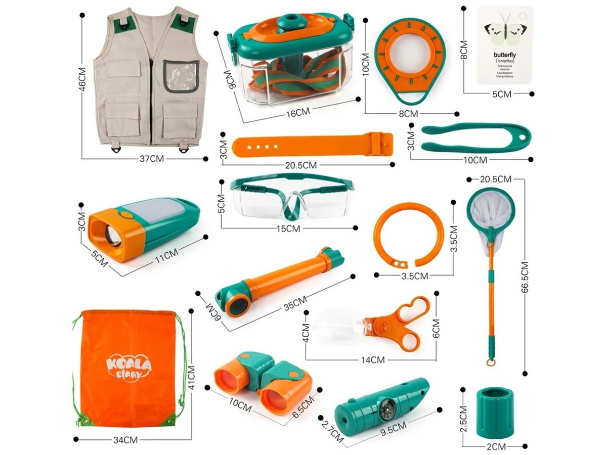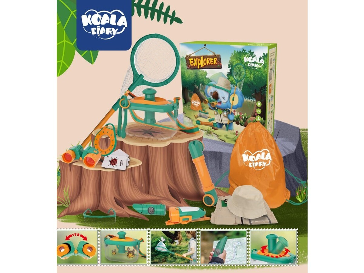Zestaw do zabawy na świeżym powietrzu pozwala wcielić się w rolę prawdziwego odkrywcy! W zestawie znajduje się mnóstwo akcesoriów, które pozwolą wprowadzić dziecko w świat obserwacji przyrody. Jest tu m.in. lornetka do obserwacji ptaków, lupa, siatka na owady oraz kompas.