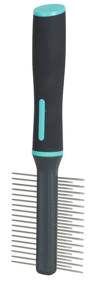 Grzebień dwustronny delikatnie rozczesuje, usuwa martwy podszerstek i wygładza sierść. Strona z szeroko rozstawionymi zębami rozczesuje i wygładza sierść, zapobiegając powstawaniu kołtunów. Zaokrąglone na końcach zęby chronią skórę zwierzęcia przed podrażnieniem.