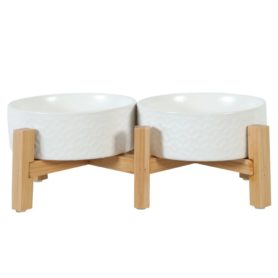 - Ozdobny wzór: Twój pupil będzie jeść w wielkim stylu. Delikatny, młotkowany wzór na ceramice dodaje im szyku, a bambusowy stojak wprowadza do domu odrobinę natury.